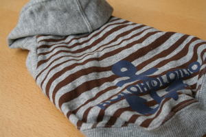 | フード・・・3 1・2・3 ¥7245 コットン100% グレーとブラウンの手書き風ボーダー地の上に、でネイビーのイカリとHOLOHOLO ILIOのロゴをあしらいました☆ |
