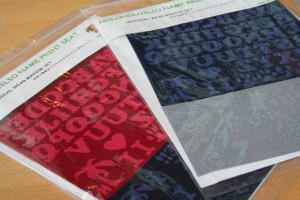 ネームプリントシート ¥840 左右逆さまのネームプリントシートをはずして、お好みの布(綿100%に限る)にのせ、アイロンをあてるだけ! できあがりの色はシートの地色になります |