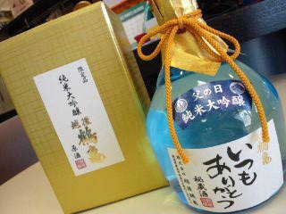 父の日限定の綺麗なブルーの斗瓶に詰めました。