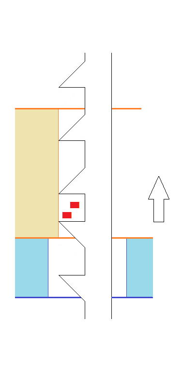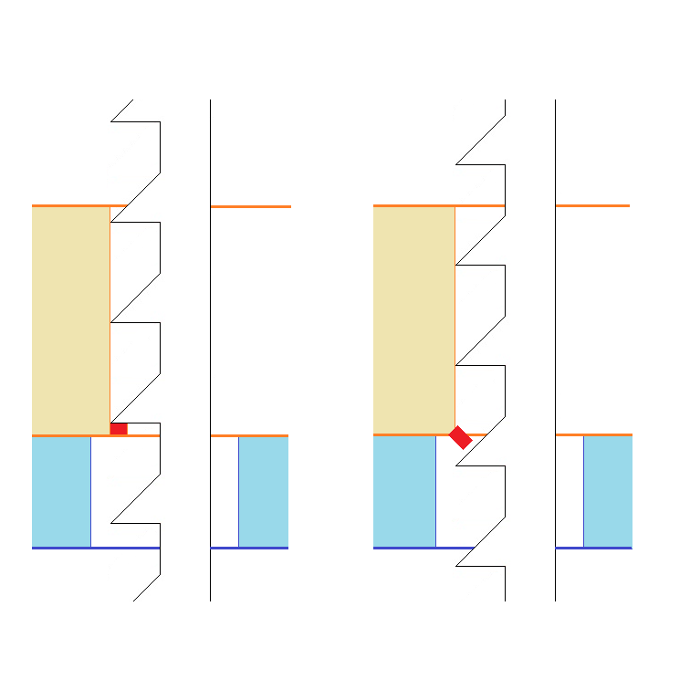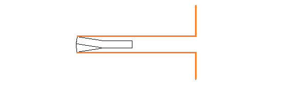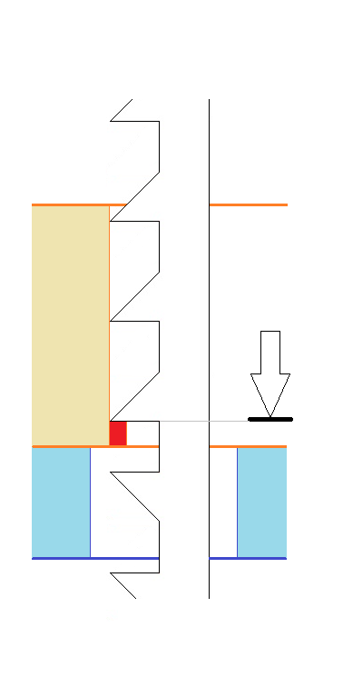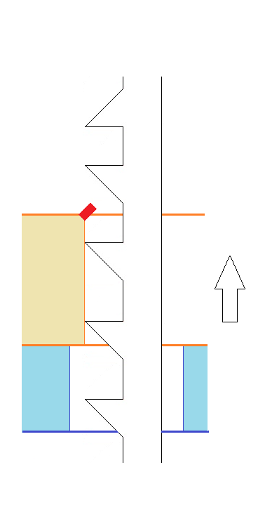 | <バリの発生の回避> 上記のようにバリは切削刃が被削物を貫通することにより発生しますので、 切削刃が被削物を貫通する手前で切削を止めればバリは発生しません。図5 ただし、これでは切削が完了せずに被削物を切り離すことが出来ません。 そこで返り刃により、残った未切削部分を下から突き上げる形で切削します。図6 これにより被削物を貫通することなく切削を行うのでバリの発生を無くす事が出来ます。 (被削物の材質によっては切削が始まる時点でバリが発生する場合もありますので、”バリの発生を低減させる”とさせて頂きま す。) |