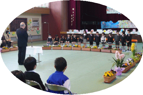 桜が咲くこの時期、入学生は笑顔と緊張で体育館に勢揃いしました。校長先生の入学許可を頂き嬉しい1年生となりました。校長先生が3つの内容を話されました。一つにあいさつや話をよく聞く。二つ目に何事も自分で自分のことをする。三つ目に友達と仲良くする。一番大切なことは命を大切にすることです。これから6年間長いですが元気に勉強に運動に頑張って、人とのつながりをも大切にして人間の成長を果たしてください。