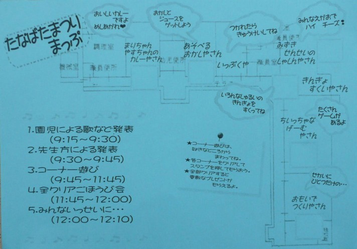 | この『たなばたまっぷ』を見ながらコーナー遊びをしたり、先生方によるお楽しみ劇場を見たり親子で楽しみました。 | |