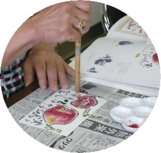 | この合言葉をもとに、 三年目になります。 今は、文化祭に向けて エコ絵手紙をみんなで 考えているところです。 楽しいおしゃべりあり、 ティータイムありと 心いやされる時間でもあります。 |
