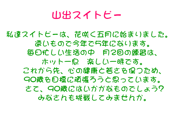 山出みのり 琴の音色に癒されて、始めた5人組み! 新しい曲を弾くたびに初心者に戻り苦戦しています。 でも、楽しくお喋りをしながら琴を弾いています。 演歌・歌謡曲・童謡などいろいろなジャンルの曲が弾けて楽しみます。 ♪一度、琴の音色を聴きに来ませんか?!? 初心者お方・・・大歓迎で〜〜す。 私達も、曲を教えてもらうたびに・・・、初心者です。 |