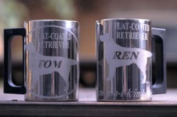 フラットコーテッドレトリバーのステンレスマグカップです。 左側がとむままさんのトム君 右側があつしさんのれん君 |