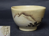 東雲焼(しののめやき)は尾張名古屋の焼物で、明治期に元尾張藩士・木全年輝によって開窯。その後、横井米禽、大島楽庵へと続いた。 場所は名古屋市民会館付近。若松の絵がほのぼのとえがかれた手に馴染む茶碗で、箱裏にはこの茶碗の詩が書かれています。 ※その他は画像参照。