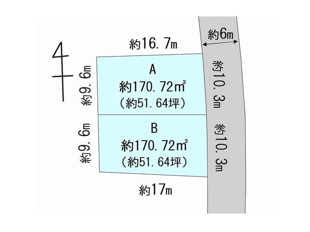 | 土地面積 | 区画A・・・約170.72㎡(約51.64坪) 区画B・・・約170.72㎡(約51.64坪) |