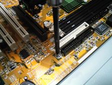 マザーボードをねじで固定します。 ねじはケースによってインチねじとミリねじがありますので注意。 ねじの取りつけは6箇所をゆる目にとりつけしておき、対角の順番で増し締めをします。 あまり強く締めすぎるとマザーボードが割れる事もあるので注意しましょう。 |