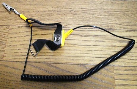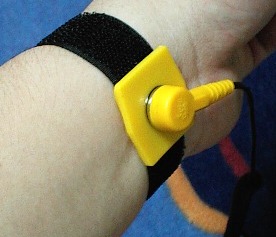 | (アドバイス) マザーボードは静電気に弱いので、静電気対策用のリストバンドの使用をお勧めします。 静電気防止グッズです。 手首にバンドを巻きます。 ケースの金属部分に端子をはさみます。 |