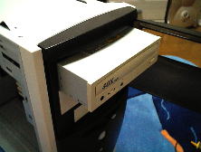 前面からCD−ROMドライブを5インチベイへ差しこみます。 ケース面と面一になるところまで差しこみます。 |