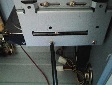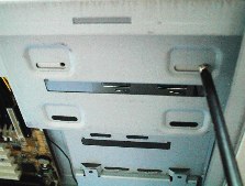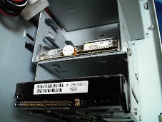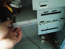 フロッピーディスクを3.5インチベイへ差しこみます。 ケースによっても変わりますが、一般的にはCD−ROMと同じ前面からが多いが、写真の様に中側から取りつける場合もあります。 これもケースの面一まで差しこみます。 |