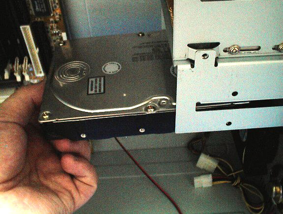ハードディスクをケース内側より3.5インチベイへ差しこみます。 一番奥に突き当てずに、少し隙間があく程度まで差しこみます。 <ハードディスクが複数台ある場合> ハードデスクが複数台あり、同じケーブルで接続する場合は、ハードディスクの背面の接続部にジャンパーピンがあるので、このジャンパーピンを差し替えで マスターとスレーブに切り替えます。またハードディスクだけでなくCD−ROMなども同じです。 |