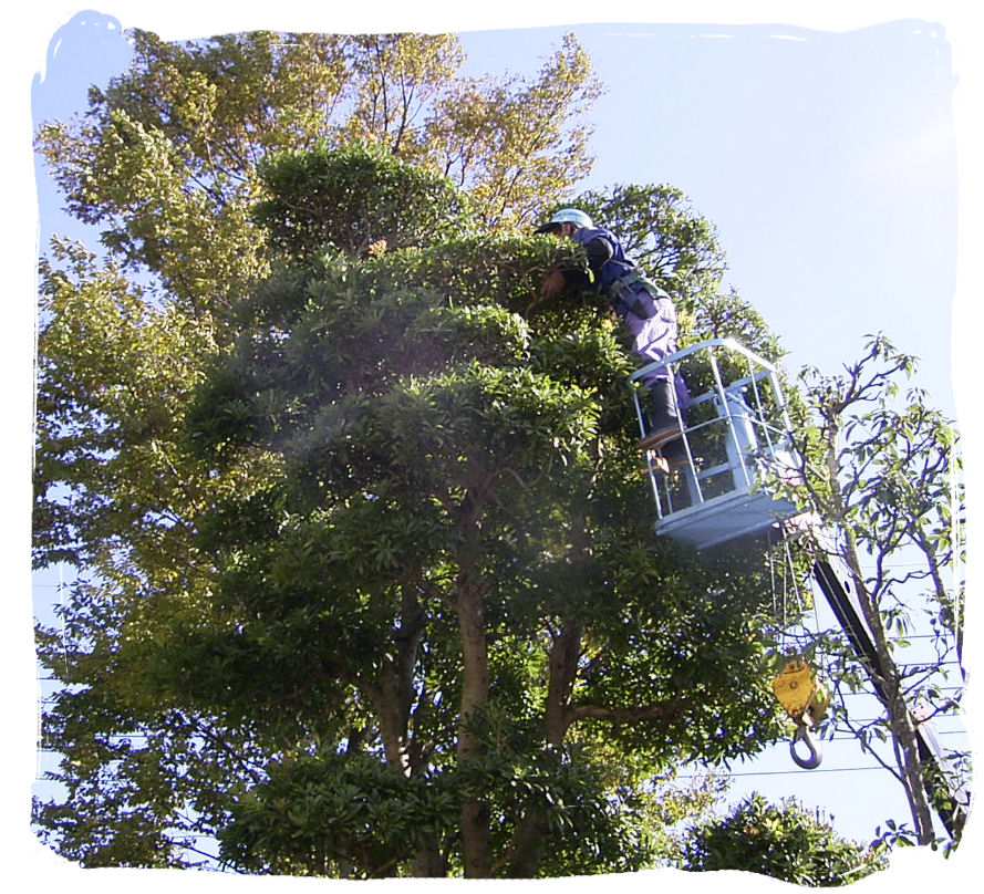 | 担当職人がお庭の剪定にうかがいます。高い木もクレーンで作業しますのでお任せください。 | |