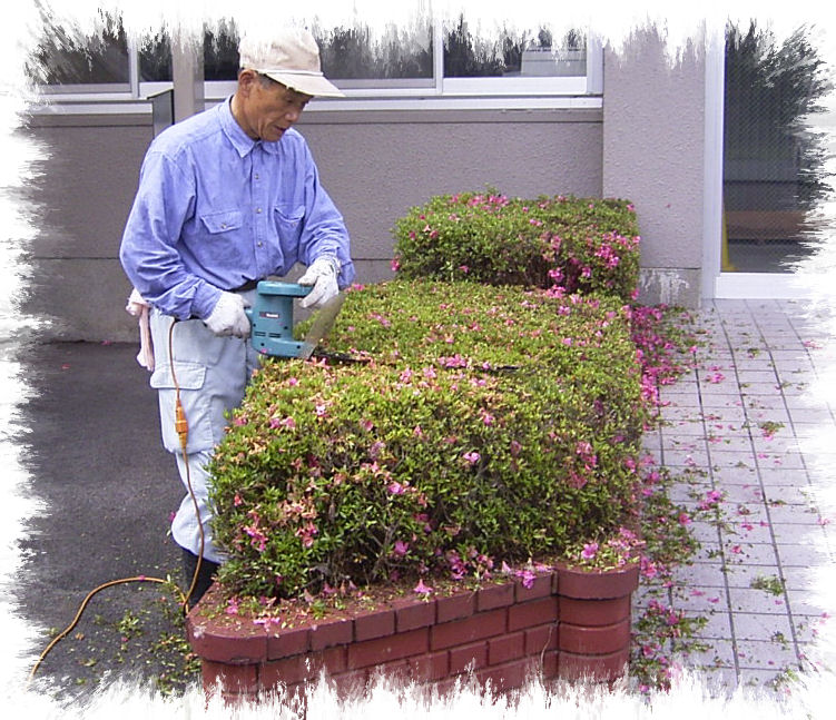 時期に合った刈り込み作業を行います。サツキツツジなどの低木は花芽が少なくなった場合は開花後に刈り込んでみてください。 |