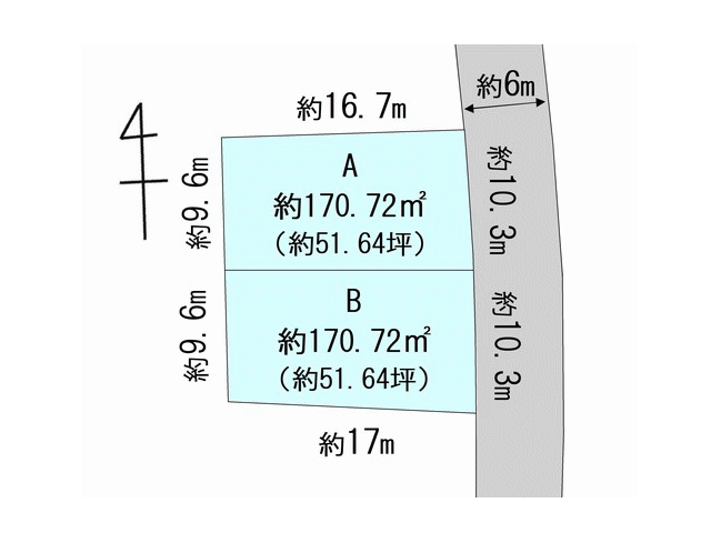 | 土地面積 | A区画・・・約170.72㎡(約51.64坪) B区画・・・約170.72㎡(約51.64坪) |